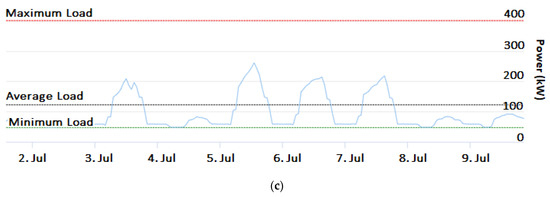 Figure 2. Weekly load profiles: (a) warehouse, (b) hospital, and (c) primary school.