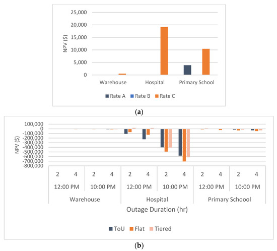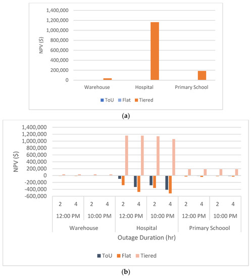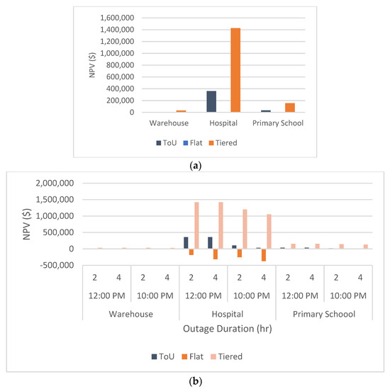 The NPV results for commercial loads in the Kansas City region, both financial and resilience analyses, are shown in Figure 4. It was found that the tiered rate gives the most favorable results in the financial analysis, giving NPV values of USD 33,121; USD 1,427,000; and USD 157,002 for the warehouse, hospital, and primary school, respectively. The ToU rate resulted in NPVs of USD 6716; USD 362,089; and USD 35,576 for the warehouse, hospital, and primary school, respectively. Although relatively small, the flat rate gave positive NPV values that should be considered.