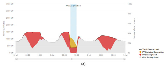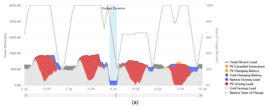 Figure 7 illustrates the system operation during a 4-h outage starting at 10 p.m. During this time, the sun’s energy cannot be immediately harvested. Therefore, all rates require a BES system that can provide power during the outage, charging during the day using the grid and PV generation. This, in turn, will impact the size of the required BES system and the overall NPV. The NPV under the ToU rate is shown to be USD 33,046 with a PV size of 2062 kW and a BES system delivering 214 kW and a capacity of 1393 kWh. The flat rate still results in a negative NPV of −USD 374,714 with a PV size of 2525 kW and a BES system delivering 254 kW with a capacity of 1393 kWh. This reiterates the necessity for an alternative and cost-effective power generation option for night outages using this flat rate.
