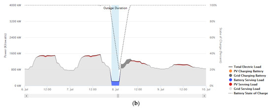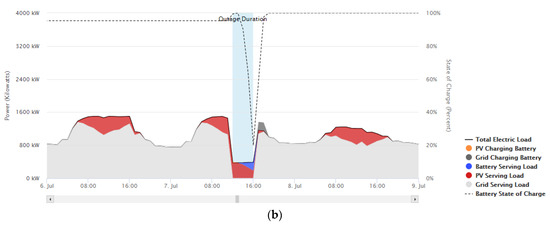 Figure 7. System operation under (a) ToU rate and (b) flat rate with 4-h outage at 10 p.m.