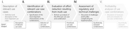 Our five-step methodology is illustrated in Figure 1. The first step is to define the use cases relevant to the field of application. The field is gradually narrowed down with each step. Steps 2 to 4 assess the synergies associated with the implementation effort along with the obstacles and challenges of multi-use applications. For this purpose, we compare separate implementations of several use cases with the simultaneous implementation of those use cases. This paper is concerned with steps 2 to 4. The fifth step, which concerns the quantitative economic evaluation of use case combinations, involves a very detailed, model-based process that should be considered separately due to the complexity of the individual step. Thus, this step is included here for the sake of completeness, as it is necessary for a holistic view, but it is not part of this work.