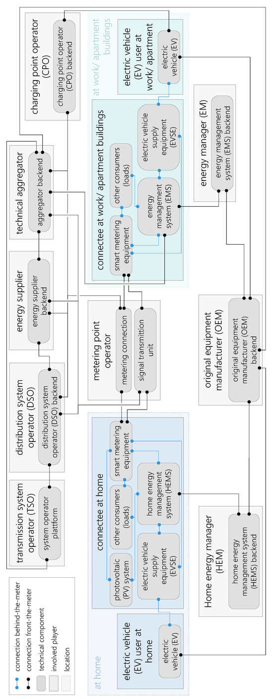 The preliminary investigation included a high-level description of the use cases. Discussions of technical designs in the project enabled us to define the designs of the use cases in this paper. For the purposes of our analysis, forty use cases are too many. Hence, this paper presents a representative selection of use cases that are relevant for implementation. We distinguish between use cases implemented in a single-family home (“at home”) and those implemented at a commercial site or in an apartment house (“at work/in apartment buildings”). We introduce this distinction, as the best-fitting implementation varies for the two places, since different players are involved, and different hardware is required. When employed at home, the grid connectee is the vehicle user. In work and apartment locations, the vehicle user is not necessarily the connectee. Charging at home is limited to private charging, whereas at work or in an apartment building, charging can be private or semi-public; hence, public charging is not covered by our investigation.