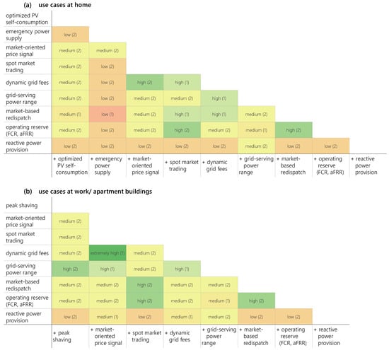 We begin by conducting a pairwise comparison to determine which use cases can and cannot be combined. The criterion that uses cases in a combination must not be based on the same incentive system that is met in all but one of the combinations of the aforementioned use cases. The exception is the combination of the market-oriented price signal and spot market trading use cases, since in both cases, the price spreads from the spot markets are used as an incentive for smart charging. Even though the technical implementation of the use cases is different for each case, these two cases are not suitable for combination. This can be seen in Figure 4, which shows the results of the third methodological step. Each colored cell of the matrices (a) and (b) represents a combination of possible use cases from the row and the column, respectively. Since in our method, it does not matter in what order the combinations are made, only the result of the evaluation is shown in the lower left diagonal of each matrix. Since all but one of the use case combinations are regarded as suitable implementation locations, there are 35 possible use case combinations at home and 27 at work/in apartment buildings, with 2 use cases per combination.