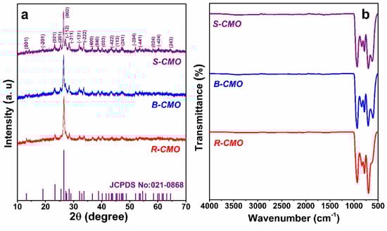 In addition, using the following equations (Equations (1) and (2)) the crystallite sizes (D) of the nanostructured materials are determined to be 84.62, 97.16, and 148.09 nm and the cell volumes (v) are 635.51, 637.53, and 644.01 , corresponding to R-CMO, B-CMO, and S-CMO, respectively [35,36].