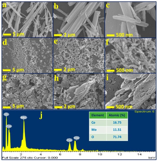 The as-synthesized CoMoO4 samples were further analyzed using SEM, to understand their morphological features and are shown in Figure 2. The utilization of different solvents apparently influenced the morphologies of the nanostructured materials. When DI water was used as a solvent medium, rods-like particles with several micrometre lengths were obtained (Figure 2a–c). Buds-like nanostructured particles were obtained when a mixture of DI water and ethanol was used as a solvent (Figure 2d–f). However, when a mixture of DI water and ethyleneglycol was used as a solvent, sheets-like nanostructured particles were obtained (Figure 2g–i). The rods-like particles appear to be aligned randomly with more void spaces in between. In contrast, the buds-like, and sheets-like particles were formed bulkily with relative fewer void spaces in between. Consequently, the effective contact area of the rods-like particles is greater compared with buds-like, and sheets-like particles. This is anticipated to enhance the utilization of more electroactive sites to interact with the electrolyte and improve the electrocatalytic performance of the electrode [40,41]. Furthermore, the EDS spectrum (Figure 2j) of the R-CMO confirms the presence of the individual elements in CoMoO4.