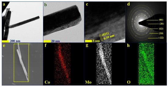 The TEM analysis was further used to evaluate the particle formation and self-assembly of the as-prepared CoMoO4 samples. TEM analysis was performed for the R-CMO catalyst due to its superior electro-catalytic activity compared with the other two electrodes. The low- and high-resolution TEM images are shown in Figure 3a–c. The nanostructured particles, as observed in the TEM image, are primary particles for the formation of rod-like morphologies through the self-assembly process [42]. The interplanar distance was determined to be 0.39 nm corresponding to the lattice plane (021), which is also consistent with the XRD analysis. The selected area electron diffraction (SAED) pattern (Figure 3d) of the sample demonstrates its polycrystalline nature. The lattice planes of the SAED pattern are indexed according to their d-spacing values as determined using ImageJ software.