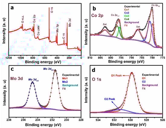 The R-CMO sample was further investigated using X-ray photoelectron spectroscopy (XPS) to study the surface-chemical composition and chemical states attributed to its superior electrochemical performance compared with the other two specimens, as shown in Figure 4. The XPS survey scan is displayed in Figure 4a, indicating the R-CMO sample contained Co, Mo, and O species. Figure 4b depicts the Co 2p core level spectrum. The spin-orbit states of Co 2p1/2, Co 2p3/2, and their related satellite peaks were identified in four regions. The +3 and +2 oxidation states of the spectrum were further divided into two peaks. The peaks appearing at 780.3 eV (Co1), and 781.5 eV (Co2) belong to Co 2p3/2, and 796.1 eV (Co3), and 797.3 eV (Co4) belong to Co 2p1/2, respectively, and reflect the Co3+ and Co2+ states of Co. Similarly, Co 2p3/2 and Co 2p1/2 have satellite peaks appearing at 787.3 eV and 803.1 eV, respectively [43,44]. Additionally, the presence of the Co2+ oxidation state is confirmed by the energy gap of 16.2 eV between the two main peaks [43,45]. In the Mo 3d spectrum, two splitting doublets associated with the Mo 3d5/2 and Mo 3d3/2 states are found to appear at 231.9 and 235.1 eV, respectively, as shown in Figure 4c. It demonstrates that the molybdenum in the R-CMO sample is in the Mo6+ oxidation state. Additionally, it is also confirmed by the difference of ~3.6 V in binding energy between the Mo 3d5/2 and Mo 3d3/2 states [43,45]. The XPS spectra of O 1s was depicted in Figure 4d and is fitted into two peaks, designated as O1 and O2, located at 530.2 and 531.7 eV, respectively. The M-O bond and M-OH bond (M = Mo and Co) of the surface-adsorbed water molecules present on the surface of the material, respectively, are represented by the O1 peak and O2 peak, respectively [46,47]. Thus, the XPS study confirms the successful formation of CoMoO4.