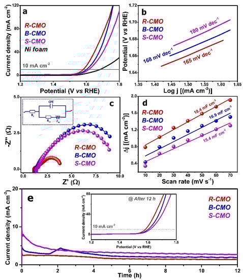 In a nitrogen gas-saturated solution of 1.0 M aqueous KOH, the electrocatalytic performance of the nanostructured materials towards oxygen evolution reaction was assessed using cyclic voltammetry (CV), linear seep voltammetry (LSV), and electrochemical impedance spectroscopy (EIS). The OER polarization curves of the R-CMO, B-CMO, and S-CMO catalysts with IR correction are shown in comparison with that of the bare Ni substrate in Figure 5a. The overpotential values of the catalysts are found to be 349, 369, and 384 mV corresponding to R-CMO, B-CMO, and S-CMO, with onset potentials of 1.580, 1.599, and 1.614 V vs. RHE, respectively, to achieve a current density of 10 mA cm−2. The overpotentials of the three catalysts are observed to be nearly identical, with a small difference of about 20 mV. However, R-CMO catalyst is found to exhibit higher electrocatalytic activity compared with the other two as-prepared catalysts and evidenced by its lower overpotential and onset potential. The smaller crystallite size and higher active surface area of R-CMO are the main factors influencing its performance. These are also the main driving forces in promoting ion transportation across the void spaces and boosting the electrocatalytic OER activity [24]. The overpotential of R-CMO catalyst outperformed many previously reported non-noble metal OER electrocatalysts (Table 1).