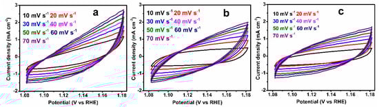 Furthermore, the chronoamperometric current-time (i-t) stability test was conducted at the overpotentials vs. Hg/HgO of the respective catalysts to evaluate the long-term durability of the catalysts as depicted in Figure 5e. The R-CMO catalyst exhibited a relatively high stability up to 12 h with no apparent change in the current density, compared with the other two catalysts. On the other hand, in the cases of B-CMO and S-CMO catalysts, the current response was observed to be unstable in the beginning because of gradual activation of the electrode material. However, after 5 h, the current response was stable and continued to be stable for up to 12 h. The polarization curves of the three catalysts after i-t stability test exhibit negligible changes as depicted in the inset of Figure 5e. The ECSA curves of the three samples are shown in Figure 6.