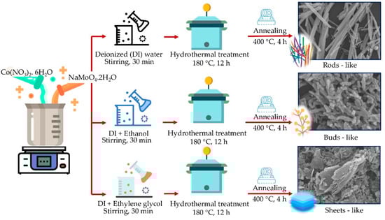 Schematic illustration of synthesis procedure for the rods-, buds-, and sheets-like CoMoO4 electrocatalysts.