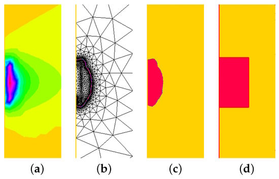 Plot of the (a) Linear Sampling solution, (b) the cut-off of , (c) the finite element mesh adaptation for the cut-off solution, and the (d) final two colored solutions that forms the best image representation of the clogging deposition.