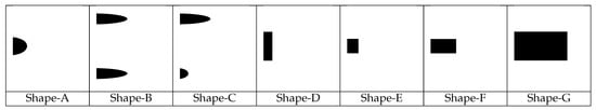 The numerical experiments follow the steps described in Section 3.2, wherein Step 1 we have selected the representative shapes as depicted in Figure 3. We have seven distinct shapes, labeled Shape-A through Shape-G, each with unique characteristics. Shape-A is a semi-circular single deposit, Shape-B consists of two identical shapes separated by a distance of 4 mm, and Shape-C has the same spacing as Shape-B but with notable differences in the two depositions. Shape-D is a relatively thin rectangle-shaped deposit located on the shell side of the tube. Shape-E is a thin and short deposit, while Shape-F and Shape-G feature thicker deposits in the form of squares, with the edge of Shape-G being almost double that of Shape-F.