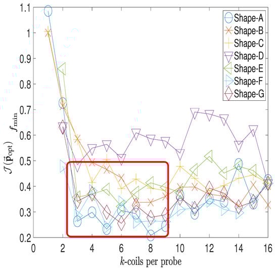 Plots of the minimal values of the merit function with respect to the number of coils (considered in one probe) for several different shapes of the deposition. Here, opt stands for optimal. The Surrogate optimization algorithm results in as an optimal solution (among which we have the number N of coils in the probe), with the data of points . The red box represents the selection of the cases that performed well.