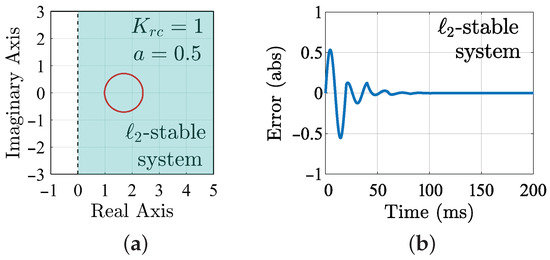 Stability evaluation of an -unstable system composed of the plant , presented in (12), and the PRC presented in Figure 8 with , , , , and . Results are obtained from the simulation. (a) Stability domain of the evaluated RC system and Nyquist diagram of (in red). (b) Error of the evaluated RC system for the presented in (12). Input signal: .