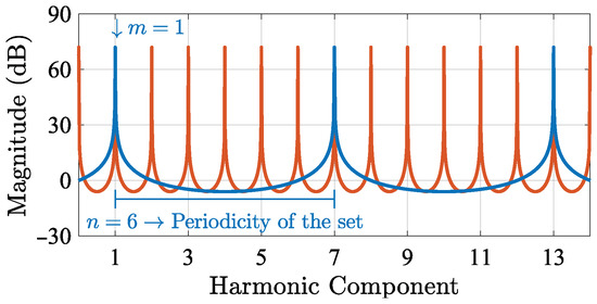 Since the target application defines the exogenous signals of the control system (and, as a consequence, the harmonic components they have), it also defines the parameters m and n. For instance, when evaluating the harmonic content of the currents demanded by a three-phase diode rectifier, one can see that they have all harmonics of the set . Thus, for this application, a PRC that controls the harmonics that belong to the set | can be used in parallel with a PRC designed to control the harmonic components of | as unique controllers, as conducted in [4].