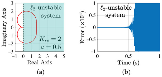 Error of an -unstable system considering the conventional repetitive controller (Figure 1) with . Results are obtained from the simulation. (a) Stability domain of the RC system for and Nyquist contour of (in red). (b) Error of the RC system for .