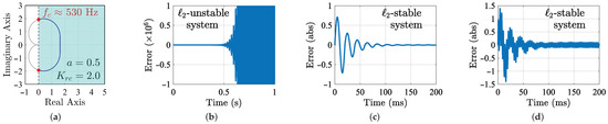 Stability comparison of different being applied to the same control system (same system evaluated in Figure 10). Control system configuration: a unit negative feedback; the plant given by (12); the controller is the PRC presented in Figure 8 with , , , , and being a FIR low-pass filter. Results are obtained from the simulation. (a) Evaluated stability domain and Nyquist contour of . reaches the stability domain boundary at 530 Hz. (b) Error of the evaluated RC system for the presented in (12) and . Input signal: . (c) Error of the evaluated RC system. designed with the proposed methodology. Input signal: . (d) Error of the evaluated RC system. designed with the proposed methodology. Input signal: .