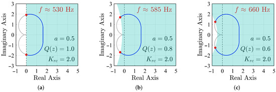 Figure 13. Maximum frequency of the Nyquist contour that is kept inside the stability domain changing for three different . Example considering the presented in (12). (a) For , the maximum frequency of the Nyquist contour that is kept inside the stability domain is 530 Hz. (b) For , the maximum frequency of the Nyquist contour that is kept inside the stability domain is 585 Hz. (c) For , the maximum frequency of the Nyquist contour that is kept inside the stability domain is 660 Hz.