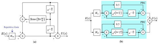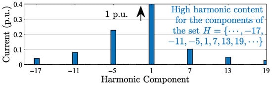 The PRC is a complex control structure (i.e., it is a block with complex signals as input and output) that allows the system to control only a selected set of harmonic components, here identified as set |. It is important to note that, for , the PRC does not control all harmonics, as the conventional repetitive controller does (Figure 7). However, multiple PRCs can be parallelized to behave as the conventional RC [29].