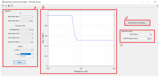 The design of the FIR filter to include the origin of the complex plane in the stability domain of RC systems is essential. It not only impacts the system stability but also affects its control performance. The filter passband and order need to be carefully selected to effectively attenuate components above the maximum harmonic frequency to be regulated. Additionally, depending on the complexity of the RC structure, it should be broken down into primitive repetitive cells (PRCs) in parallel to determine where the FIR filter should be allocated [18]. To the best of the authors’ knowledge, no literature presents a detailed step-by-step process for designing FIR filters for RC systems or a tool that automates this project.