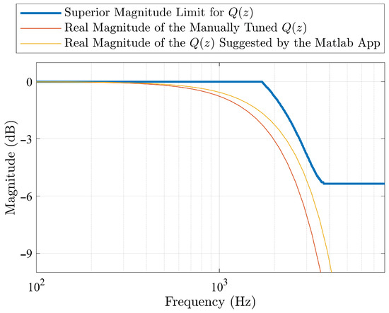 Using this algorithm, the Matlab app can find a FIR filter that satisfies the requirements imposed by the magnitude limit curve while keeping the filter gain as close to unity as possible for the widest possible range of frequencies. It is worth noting that, as mentioned in [23], in frequencies where the filter has a non-unity gain, the system tends to have a non-zero steady-state error. This behavior is discussed in Section 3 of this paper. Therefore, the best filter is the one with the widest possible unity-gain passband.