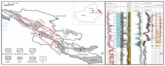 Geological background of Santanghu Basin; (a) Tectonic sketch of the basin and location of the study area (adapted from ref. []); (b) Single well histogram of well A.