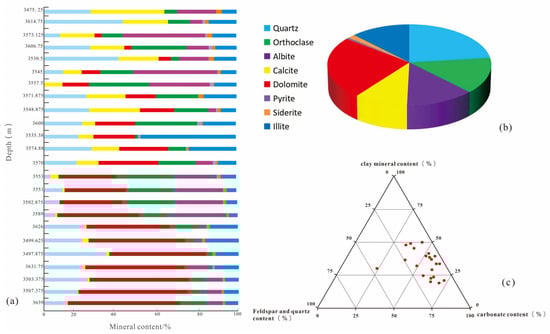 The clay mineral content was low; the average content was 12.45%, and it was mainly feldspar minerals and carbonate minerals, quartz, potash feldspar, and albite, with a maximum quartz content of 46.879% and an average value of 23.104%. The maximum potassium feldspar content was 30.701%, with an average of 14.439%; the maximum albite content was 38.606%, with an average of 12.890%; carbonate minerals were mainly dolomite and calcite, and the maximum calcite content was 35.711%, and the average was 10.051%; the maximum content of dolomite was 53.317%, and the average content was 24.916%. There were also some secondary minerals such as pyrite and siderite. The maximum content of pyrite was 2.093%, and the average content was 0.675%. The maximum content of siderite was 2.984%, with an average of 1.502% (Figure 2a,b). According to the mineral composition characteristics of the area, the rock types in the shale reservoirs in the Lucaogou Formation were divided by using the classification scheme of the four-component three-terminal element of literature [], with the content of carbonate rock, the total content of quartz and feldspar, and the content of clay minerals as three-terminal elements. The rock types in this area were mainly argillaceous dolomite, composed of microcrystalline dolomite and a small number of clay minerals, followed by sandy dolomite, which was composed of microcrystalline dolomite and a small amount of quartz, albite, and other minerals; it contained only a very small amount of dolomitic siltstone dolomitic mudstone (Figure 2c).