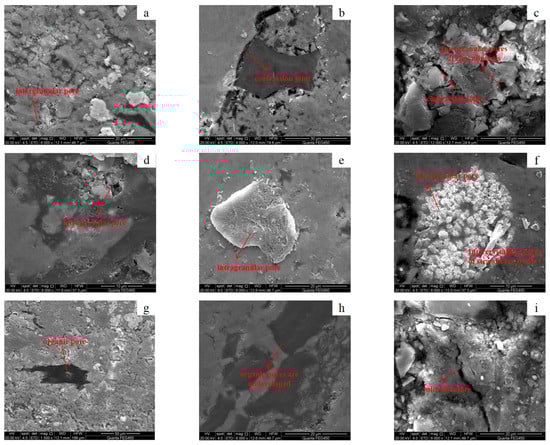 Reservoir space types of the second member of the Lucaogou Formation. (a) Intergranular pores (3599.98 m, dolomite content 15.758%); (b) Intergranular pores/edge contraction joints (3638.98 m, 53.317%); (c) Intergranular pores/marginal contraction sutures (3670 m, 38.2%); (d) Intergranular pores and intragranular pores (3614.81 m, 0%); (e) Intragranular pores (3503.41 m, 47.893%); (f) Intragranular pores (3638.98 m, 53.317%); (g) Organic pores (3599.98 m, 15.758%); (h) Organic pores (3574.87 m, 22.541%); (i) Microcracks (3589.04 m, 37.686%).