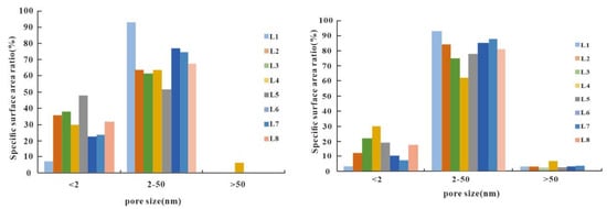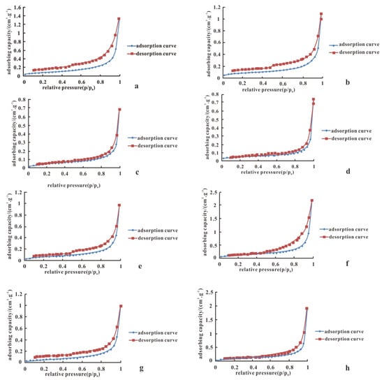 The basic principle of low-temperature nitrogen adsorption is that, at low temperatures, nitrogen will be physically adsorbed on the surface of the sample. With the increase in pressure, the monolayer adsorption gradually reaches multilayer adsorption, and capillary condensation occurs when the corresponding pore size reaches the critical pressure. Then, gradually reducing the partial pressure, the adsorbed nitrogen begins to desorb. The adsorption isotherms of eight samples showed an inverse ’S’ type (Figure 4). The adsorption–desorption curves of typical mesoporous materials proposed by SING were the same []. The desorption isotherm of the sample was located above the adsorption isotherm, which did not overlap and formed a hysteresis loop.