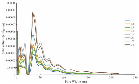 The calculation results of surface area, pore volume, and pore size (Table 2) showed that the specific surface area of 8 samples was 0.1410~0.4510 m2/g, and the average specific surface area was 0.2668 m2/g. The pore volume was 1.057~2.961 × 10−3 cm3/g and the average pore volume was 1.9094 × 10−3 cm3/g. At present, there is no unified understanding of the classification of shale pores at home and abroad, but it is more common to use the IUPAC pore classification method: microporous (pore diameter is less than 2 nm), mesoporous (pore diameter is between 2 and 50 nm), and macropores (pore diameter is greater than 50 nm). The specific surface area and pore volume of shale samples in the study area were small, and there was little pore development. The specific surface area density of samples was mainly distributed below 50 nm. The specific surface areas of micropores, mesopores, and macropores accounted for 32.67%, 67.15%, and 0.18% of the total specific surface areas, respectively. The specific surface area of micropores and mesopores in shale accounted for more than 99% of the total specific surface area, indicating that micropores and mesopores with pore diameter less than 50 nm provide most of the pore specific surface area, and were the main sites for shale oil and gas adsorption. The pore volume density distribution was bimodal. The main peak of 8~20 nm was 28~43 nm (Figure 5 and Figure 6). The micropore volume of shale samples accounted for 14.95%, the mesopore volume accounted for 82.47%, and the macropore volume accounted for 2.58%, which further confirmed that the mesopore provided the main pore storage space, and the contribution of micropores and macropores was less. The main pore size was 28~43 nm.