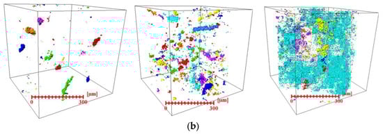 Micro–nano CT experiments were carried out on three samples with dolomite content of 0%, 26.058%, and 53.317%, numbered L1, L5, and L8. After comparing the data obtained by pore extraction, we can find that (Table 3): The comparison showed that, from L1 to L5 and L8, the contact relationship between particles became looser and looser (Figure 8a,b), the dissolved pores between strip particles gradually increased, the dissolved pores in isolated particles gradually decreased, the connectivity gradually improved, and the throat became larger and larger. The pore throats of the L8 samples with high dolomite content were mostly coarse tubular and banded distributions in three-dimensional space, and the distribution was uniform. There were 67.85% of throats with good connectivity. The average pore radius was 3.09 μm, the throat length was 47.20 μm, the number of identified pores was 55,555, and the pore volume was 9,174,542.24 μm3/g (Table 3). The pore throats of samples with dolomite content of 26.058% were mostly banded and spherical in three-dimensional space. The pore throats of the L1 sample with the lowest dolomite content was mostly isolated and spherical in three-dimensional space. The number of identified pores was 6674, the average pore radius was 1.85 μm, and the throat length was 8.67 μm. Only 0.46% of the throats had good connectivity. It can be seen that dolomite content has an impact on pore structure. High dolomite content mainly plays a supporting role in the reservoir, preventing compaction, improving pore structure, and increasing the connectivity of micropores.