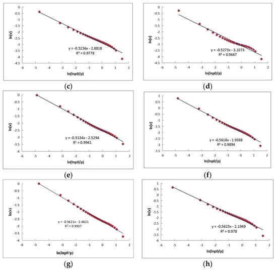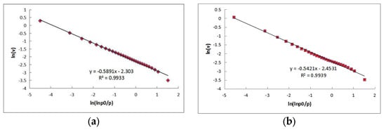 The pore surface of shale has fractal characteristics. The microscopic pore structure characteristics of the shale reservoir can be expressed indirectly by fractal dimension, and its value D is between 2 and 3. When D is close to 2, the pore surface is smooth, and when D is close to 3, the pore surface is very rough [,,,,]. The fractal dimension qualitatively reflects the uniformity of pore development. Micropores, mesopores, and macropores are developed, and the pore size distribution span is large. If only one pore is developed, that is, the pore volume and specific surface area are only provided by one type of pore, then the fractal dimension is small. The fractal dimension has different effects on the occurrence and migration of oil and gas. The larger the fractal dimension is, the more complex the pore structure is, which is beneficial to oil and gas adsorption and storage, but not conducive to oil and gas seepage. The commonly used method to calculate the fractal dimension is the FHH equation, Formula (1).