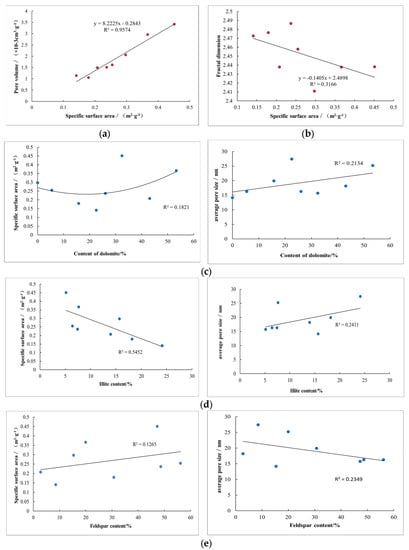 Correlation diagram between pore structure parameters and control factors of the second member of Lucaogou Formation. (a) Relationship between specific surface area and pore volume; (b) Relationship between specific surface area and fractal dimension; (c) Relationship between dolomite content and specific surface area and average pore size; (d) Relationship between illite content and specific surface area and average pore size; (e) Relationship between feldspar content and average pore size and specific surface area.