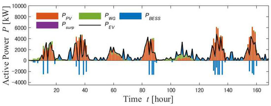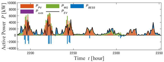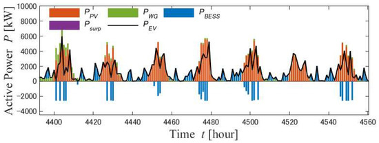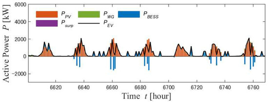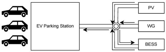 8], PV and WG were considered for power generation facilities that could generate electricity 24 h per day. However, the researchers assumed a grid-connected microgrid, which limited the locations for building EV charging stations. The microgrid to which an EV charging parking station was connected was connected to the PV, WG, and storage batteries, and the structure was considered to be able to simultaneously meet the residential load [