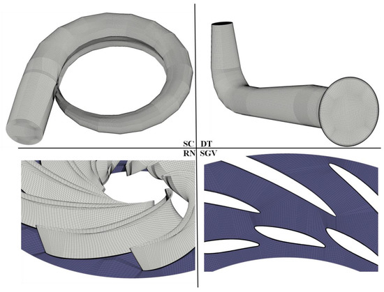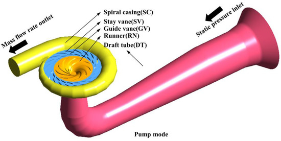In our study, the fluid domain consisted of four parts, namely, the draft tube, the runner, the stay/guide vane, and the spiral casing. Figure 1 presents the established 3D computational region through UX 11.0. The head of the investigated pump turbine was 425 m, and the specific speed (nq) was 36.1 (m, m3/s). The detailed operation and the geometric parameters of the scaled pump turbine model are presented in Table 1.