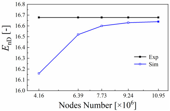 For grid independence validation, five grids with 4.16 × 106, 6.39 × 106, 7.73 × 106, 9.24 × 106, and 10.95 × 106 nodes were generated. The detailed information of these five sets of grids is listed in Table 2. Since hump performance is our investigation object, the head value at best efficiency point 1.00QBEP was selected as the criteria of grid independence. Figure 4 reveals that, when the total number of nodes increased from 7.73 × 106 to 10.95 × 106, the variation of the head value was within 0.5%. Accordingly, the grid with 10.95 × 106 nodes was selected in the present paper for all simulations.