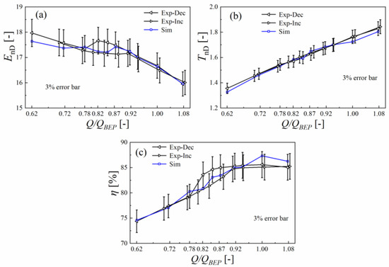 It was found that, in the experiment, the energy characteristic performed differently in the discharge increase and decrease directions. This phenomenon is known as the hysteresis characteristic. It is proven that only numerical calculation with initial conditions obtained from neighboring discharge operation points could reproduced this phenomenon [6]. To avoid the influence of the hysteresis characteristics, all numerical simulations were conducted without initial conditions. Figure 6 reveals that the relative errors of all simulated performance characteristics were less than 3%.