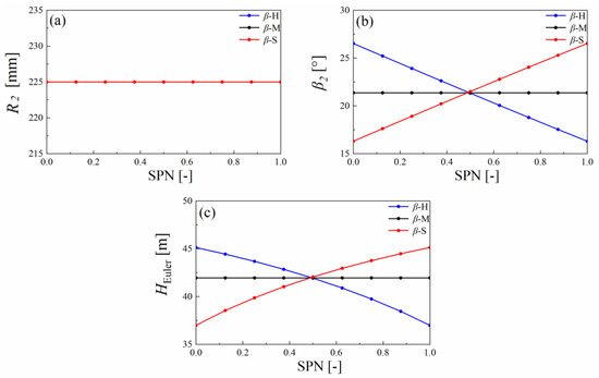 Figure 10 shows the distributions of the Euler head in different plans, and it can be seen that the Euler head in plan β-S was increased compared to that in plan β-M, and the improvement degree was within 1.6%. On the other hand, plan β-H could only raise the Euler head at some specific operating points in the hump region. Moreover, for plan β-H, the Euler head suddenly dropped at 0.85 QBEP, corresponding to the same discharge operating point that the valley point appears at in its energy-discharge curve. Hence, the sudden drop of the Euler head is attributed as the reason causing the hump characteristics in plan β-H. It should be noted that the spanwise-averaged Euler head in the three runners was the same theoretically, while the CFD results show that the mass-flow-averaged Euler head under different plans in the three-dimensional flow field was quite different, indicating that the setting angle distribution at the runner outlet can significantly affect the flow characteristics in the spanwise direction. However, this effect cannot be clearly explained by Equation (5). To resolve this shortcoming, Equation (9) was adopted to express the Euler head in the three-dimensional flow field. It is known that the Euler head is a function of the absolute flow angle α2. The comparisons of absolute flow angle α2 distribution in the spanwise and circumferential directions are investigated in the following section. Moreover, four typical discharge operation points, including 0.78 QBEP, 0.82 QBEP, 0.87 QBEP, and 1.00 QBEP were chosen.
