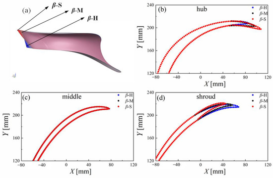 Blade geometry comparison in typical planes: (a) blade geometric modeling, (b) hub, (c) middle, and (d) shroud.
