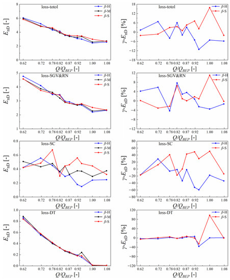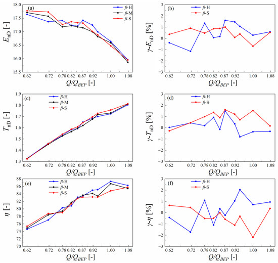 When it comes to efficiency characteristics, it can be seen that plan β-H and plan β-S played opposite roles for the operating points apart from the hump region. Plan β-H can significantly increase the efficiency at discharge operation points over 0.8 QBEP while decreasing the efficiency at discharge operation points less than 0.7 QBEP. By contrast, plan β-S mainly increased the efficiency at discharge operation points less than 0.78 QBEP, whereas it decreased the efficiency at discharge operation points over 0.85 QBEP.