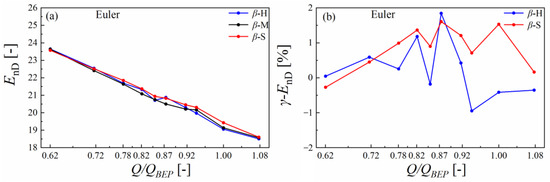 Figure 9 depicts the hydraulic characteristic comparison among three different setting angle distribution plans. It can be seen that different distribution plans show different energy-discharge characteristics, especially in the hump region. Compared with plan β-H, the valley point in plan β-M and plan β-S moved to smaller operating points, and plan β-S could enlarge the hump margin. Compared with plan β-M, plan β-H increased the energy factor at discharge operation points over 0.72 QBEP while plan β-S decreased the energy factor in discharge operation points less than 0.92QBEP, which means that both plan β-H and plan β-S can effectively increase the energy factor in the hump region. The hump characteristics improvement comparison between our case and other published papers is shown in Table 3. Even if the relative improvement rate in our case is not as large as the relative improvement rate in other papers, the hump margin in plan β-S increased from 4% to 4.5% compared with the hump margin in the original runner β-M, which fully meets the engineering standard. Moreover, compared to other methods, optimization of the runner outlet is more likely to be achieved in the design stage and be applied in engineering applications.