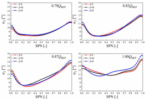 Figure 11 illustrates the distributions of the mass-flow-averaged absolute flow angle α2 along the spanwise direction at the runner outlet. It can be seen that setting angle distribution significantly affected the absolute flow angle α2 distribution at the investigated operating points. At 1.00 QBEP, the distribution of the absolute flow angle α2 at the runner outlet was highly consistent with the theoretical setting angle distribution plans: the position with a large setting angle β2 tends to have a small absolute flow angle and vice versa. With the decrease of discharge, the differences of the absolute flow angle α2 distribution under the three plans became smaller. At 0.87 QBEP, the smallest absolute flow angle was achieved in plan β-S in the SPN0.2–SPN1.0 region, and the largest absolute flow angle was obtained in plan β-M in the SPN0.3–SPN0.7 region in the spanwise direction at the runner outlet. When it comes to 0.82 QBEP, the absolute flow angle in plan β-S was the largest in the middle of the spanwise direction (about SPN0.4–SPN0.8), while plan β-H provided the largest absolute flow angle for the rest region in the spanwise direction. At 0.78 QBEP, the difference of the absolute flow angle distribution under the three plans could only be distinguished at the hub region where the absolute flow angle in plan β-S was smaller than that in the other two plans.