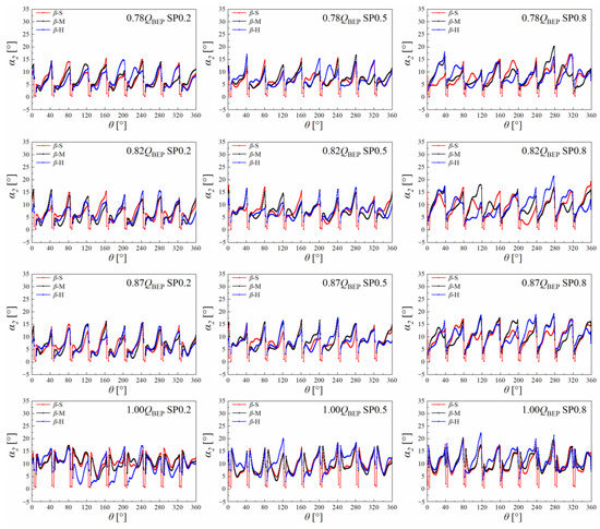 The absolute flow angle value in the specific spanwise direction can be defined as the circumferential-averaged value of the absolute flow angle. Therefore, it is necessary to investigate the absolute flow angle distribution in the circumferential direction. Figure 12 shows the comparison of absolute flow angle α2 distributions in the circumferential direction under three different plans. In this section, three typical planes from hub to shroud in the spanwise direction were selected and marked as SPN0.2, SPN0.5, and SPN0.8. In 1.00 QBEP, the absolute flow angle in the plan β-H was the smallest and plan β-S provided the larger absolute flow angle in most regions in the circumferential direction, which is consistent with the theoretical design. However, when it comes to the operating points in the hump region, the differences of absolute flow angle α2 distribution in the circumferential direction under the three different plans could hardly be distinguished, indicating that the influence of different setting angle distribution plans on absolute flow angle distribution in the circumferential direction was not large enough to be captured; only in the circumferentially averaged method can the influence be distinguished.