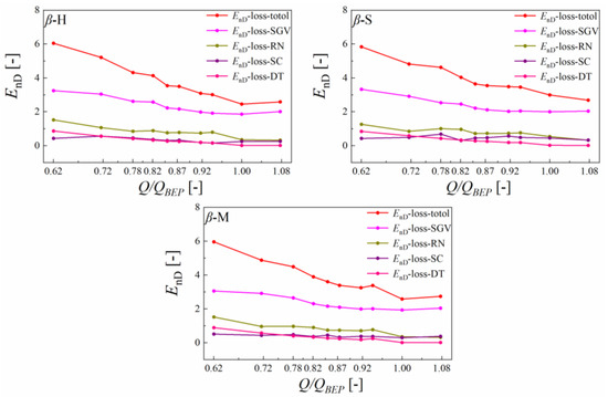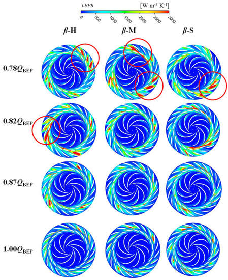 In this section, the influence of the setting angle distribution on the hydraulic loss distribution in the flow domain is investigated in detail. Recently, the local entropy production rate (LEPR) method, proposed in previously published papers [26], has been proven to be accurate and practical enough to describe the position and level of hydraulic loss in hydraulic machinery. Hence, the LEPR method was employed to depict hydraulic loss distribution in the stay/guide vane domain as well as the runner domains.