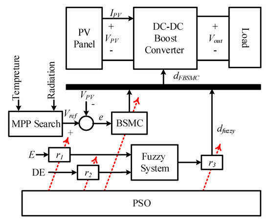 In [3], various methods of MPPT for PV systems were reviewed. Among these methods, BSMC was one the methods with more advantages and fewer drawbacks. Therefore, it is used as the base for our proposed controller. It is obvious that chattering is the main drawback of SMC methods, including BSMC. Here, to eliminate this effect, a fuzzy system, inspired by [32], is suggested to provide soft switching based on the ratio between power variation and the voltage variation of the PV panel in two consecutive sampling times, as well as its variations in two consecutive sampling times. Combining the structures of [26,32], we benefited from the advantages of both. However, their drawbacks are weakened dramatically. On the other hand, this combination increased the design parameters and complicated the selection of them by trial and error. In this paper, PSO as an old, well-known optimization method is used to optimize the design variables. Combining these three high-performance methods (BSMC, fuzzy, and PSO) to use the advantages of each one and attenuate their drawbacks is the main contribution and novelty of this paper.