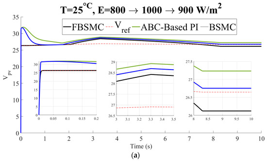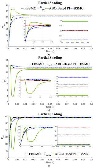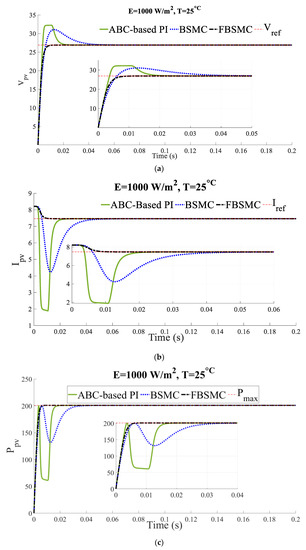 Scenario 1 (Normal operating conditions): In this scenario, the temperature is and solar radiation is . Figure 4 compares the voltage, current, and power of the PV panel controlled with the BSMC [26], ABC-based PI control [31], and FBSMC. For rational comparison, the required parameters of all three controllers are optimized using PSO.