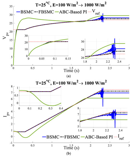 Scenario 2 (Constant Temperature and variable solar radiation): The temperature is equal to and the solar radiation increases linearly from at to at . Figure 5 compares the voltage, current, and power of the PV panel of the controlled system with the BSMC [26] and FBSMC.