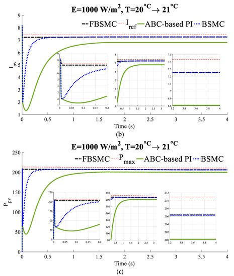 Scenario 3 (Constant solar radiation and variable temperature): The solar radiation is equal to . The cell temperature increases from at linearly to at . Figure 6 compares the voltage, current, and power of the PV panel of the controlled system with the BSMC [26] and FBSMC.