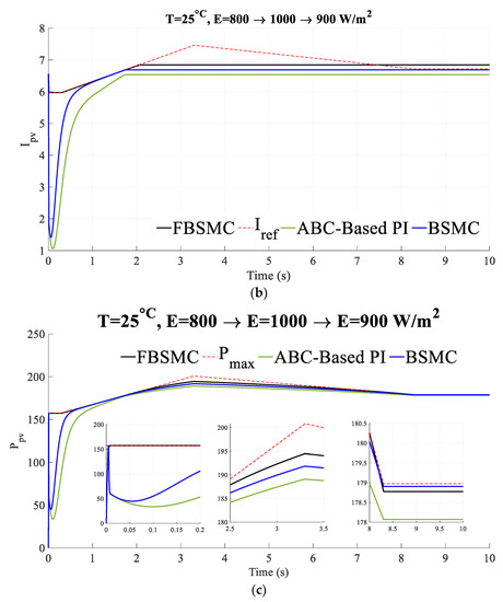 The simulation results show that by applying the FBSMC approach in comparison to the other controllers, the MPP is tracked faster and more accurately. In other words, the best adaptation to the rapid variation in solar irradiation is obtained by this controller. The chattering phenomenon is eliminated using the fuzzy system in comparison to BSMC. Also, because of the nonlinear nature of the system, BSMC [26] as a nonlinear controller outperforms ABC-based PI control [31].
