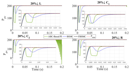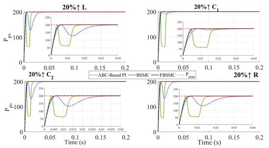 To evaluate the robustness as the performance of the controller under normal operating conditions, variations in the resistance load,, and parameters of DC-DC converter components including capacitor capacitance, , and inductance of the inductor, , are considered. Figure 10 and Figure 11 show the PV power for a 20% increase and a 20% decrease in the above-mentioned parameters, respectively. Table 6 and Table 7 compare dynamic efficiency applying the BSMC [26] and the FBSMC for a 20% increase and a 20% decrease in the parameters mentioned above. The results demonstrate the robust performance of BSMC and FBSMC while ABC-based PI control is not robust. Despite the substantial changes in the parameters, the FBSMC maintains its superiority over the others and has a lower variation percent in power extracted, which verifies its robust performance.